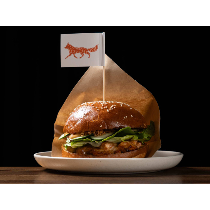 Булочка бріош, котлета з лосося, помідор, огірок, салат ромен, вершковий теріякі, соус Чайна та соус Спайсі.