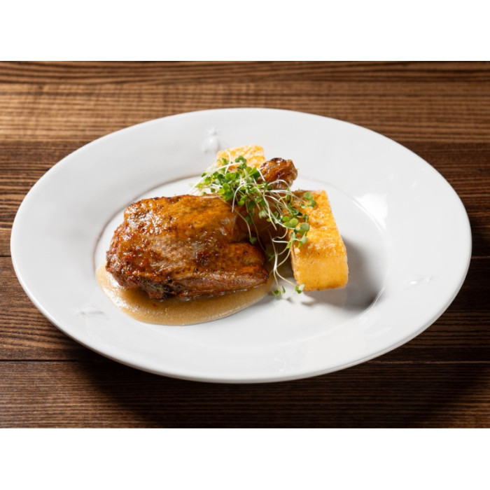 Качина ніжка конфі, соус з яблук та селери, смажена полента, мікс зелених салатів