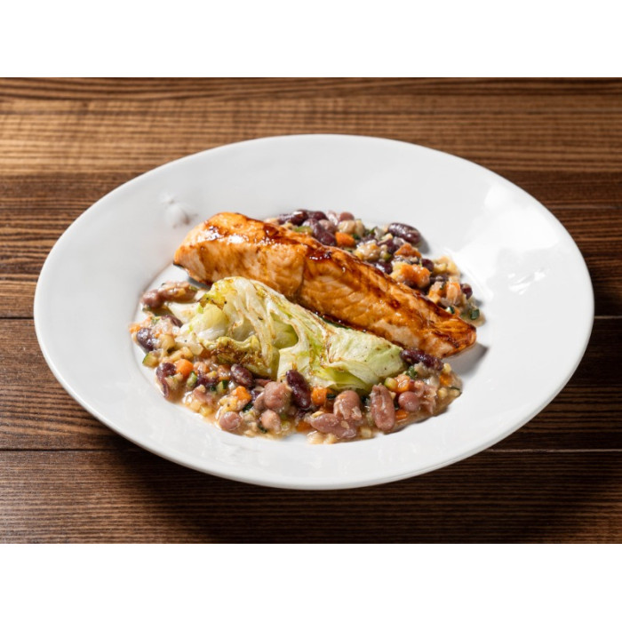 Запечений лосось, карамелізований стейк з салату Айсберг, касуле з квасолі та овочів