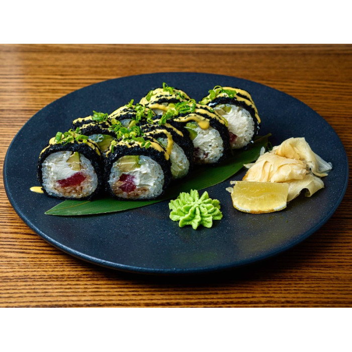 Рис, норі, крем-сир, філе тунця, авокадо, соус хойсин, темпурний кляр, сухарі панко, соум манго, зелена цибуля