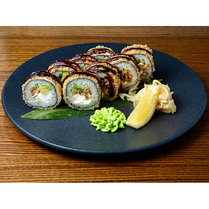 Рис, норі, крем-сир, вугор смажений, авокадо, огірок, темпурний кляр, сухарі панко, соус унагі