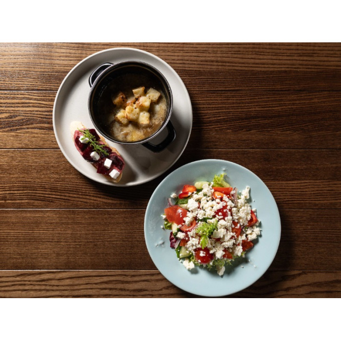 Крем-суп грибной, брускет с хумусом, салат из баклажанов