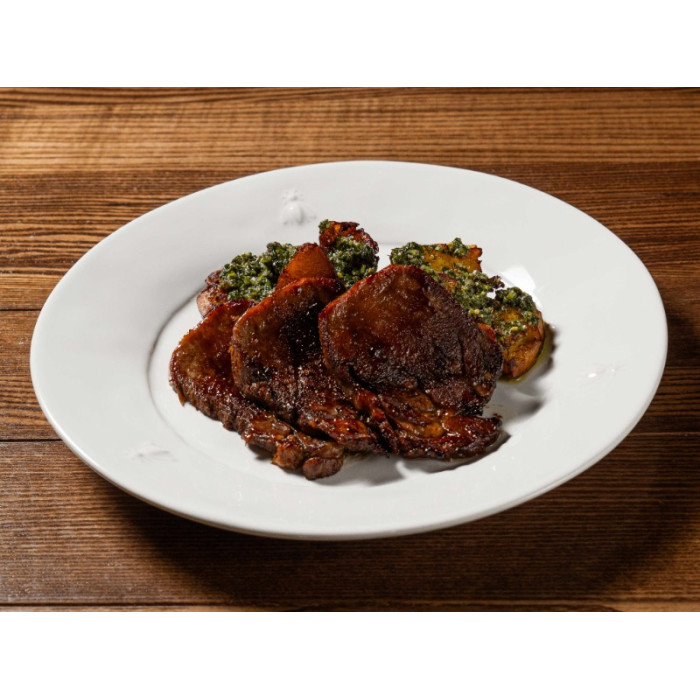 Карамелізований яловичий язик, хрустка картопля, соус сальса верде.
