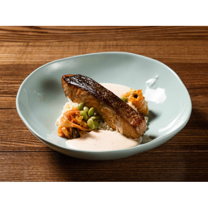 Маринований у пасті місо запечений лосось, кускус із соусом понзу, капуста кімчі, соус вершковий карі, мариновані боби едамаме.
