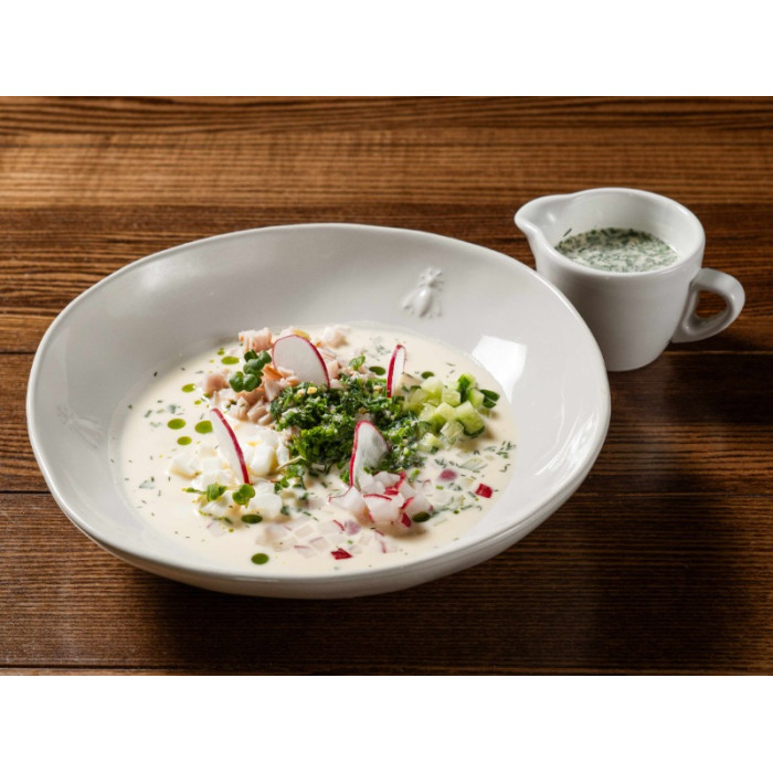 Тунець копченй, дорадо відварний, огірок свіжий, редис, цибуля шніт, яйця, зелень, основа з кефіру з гірчицею та вершковим хріном.