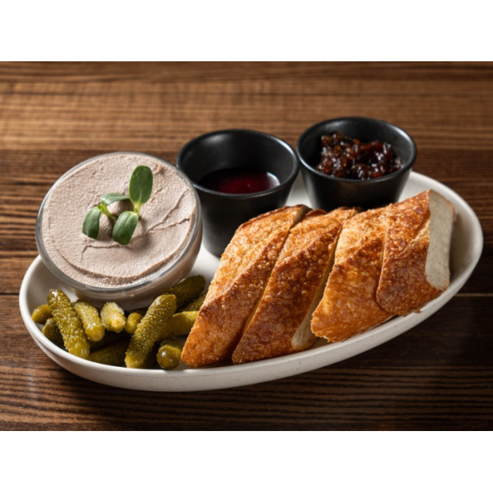 Ніжний паштет з курячої печінки, подається зі смородиновим та цибулевим конфітюром, багет подовий пшеничний ЖОРНОВА, огірки корнішони