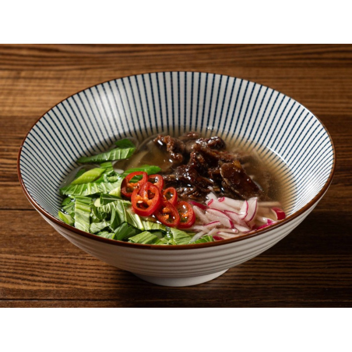 Бульйон із суміші ароматних спецій, соус хойсін, хрустка яловича вирізка, редис, капуста пак чой, перець чилі, рисова локшина.