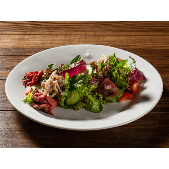 Мікс зелених салатів, ростбіф із витриманої яловичої вирізки, помідор чері, огірок, гриби енокі мариновані, соус чимічурі, шпинат свіжий.