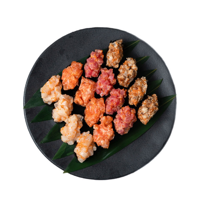 Рис, нори, филе лосося, филе тунца, угорь жареный, расческа, икра летучей рыбы, майонез КимЧи.