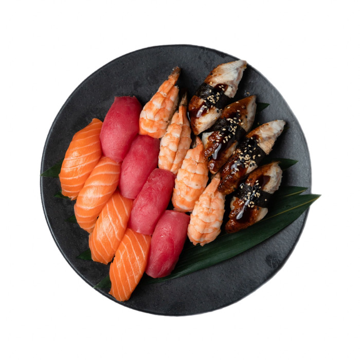 Рис, нори, филе лосося, филе тунца, угорь жареный, креветка вареная, унаги соус, кунжут.