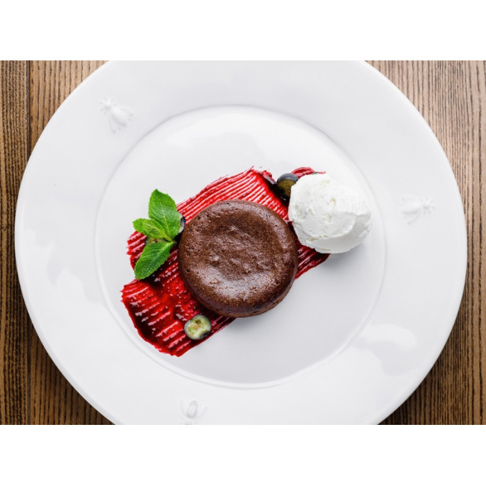 Фондан (шоколадне тістечко), смородинове варення, ванільне морозиво, лохина, карамелізовані горіхи, м'ята