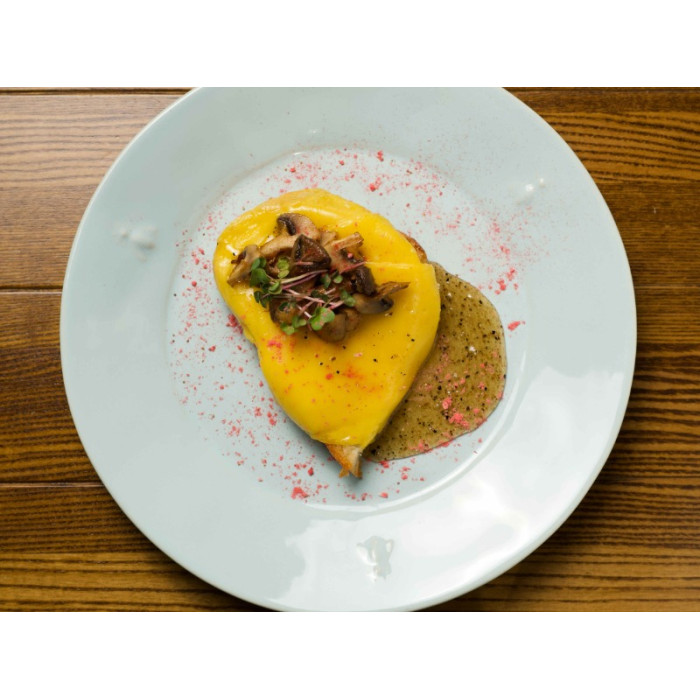 Хліб подовий пшеничний, крем-сир веганський копчений, гриби печериці, мед, трюфельна паста, сублімована малина, мікрогрін