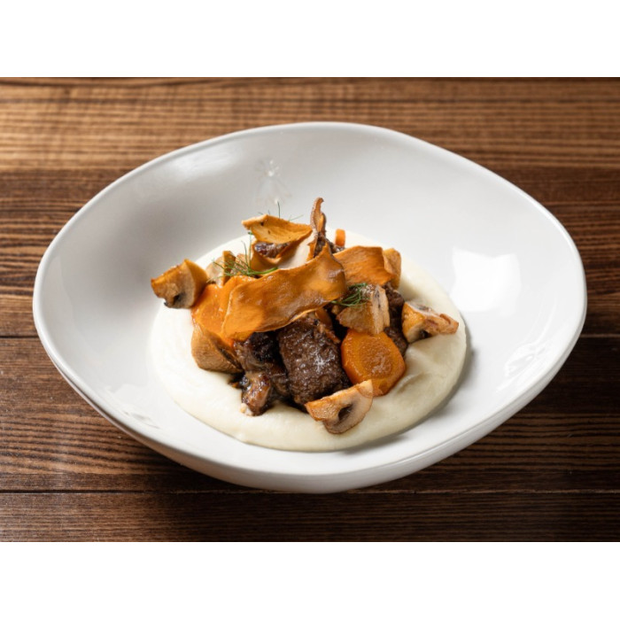 Яловичина, тушкована у вині, картопляне пюре, карамелізована морква, смажені печериці, чипси з Ерингів